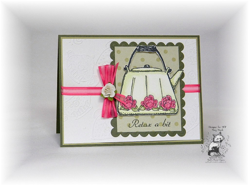 Instead of a coffee mug I used a teapot. My image is on a rectangle Spellbinders die instead of an oval. The teapot image & sentiment are from a new stamp set from Marks Finest Papers - "relax a bit". I colored with prismacolor pencils and gamsol.